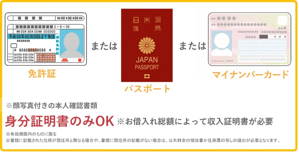 身分証を写メで送るだけ 借入総額により収入証明書が必要 |